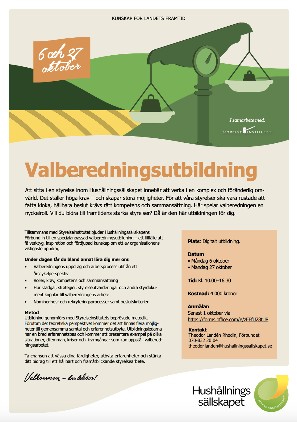 Hushållningssällskapens Förbund har tillsammans med Styrelseinstitutet utarbetat ett styrelseutvecklingsprogram som riktar sig till styrelseledamöter inom Hushållningssällskapet. Utbildningen pågår under två dagar och har fokus dels på grunderna i styrelseutövningen, på fördjupning av styrelsearbetet och styrningsfrågor, och sist men inte minst – på vår verklighet.